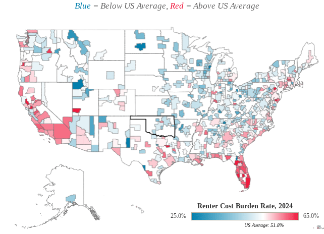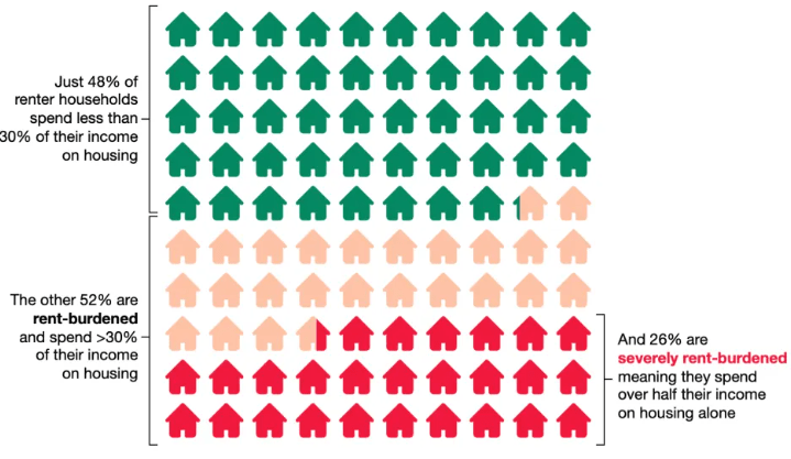 51.8% of all renter households are considered cost-burdened, spending more than 30% of their monthly income on rent.