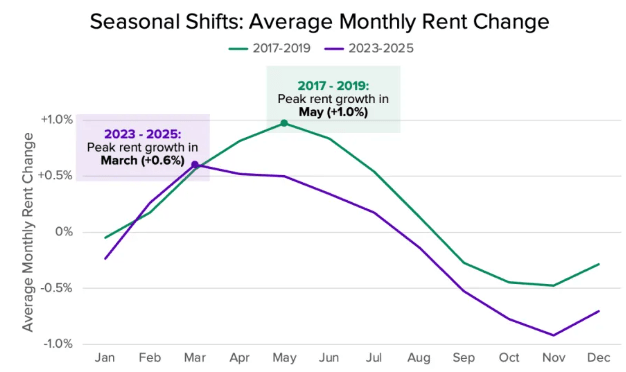 Over the past three years, we’ve seen a noticeable shift in the timing of this seasonality. Since 2022, rental activity is more evenly distributed throughout the calendar year, annual rent declines exceed annual rent increases, and peak rent growth has moved up earlier in the year.
