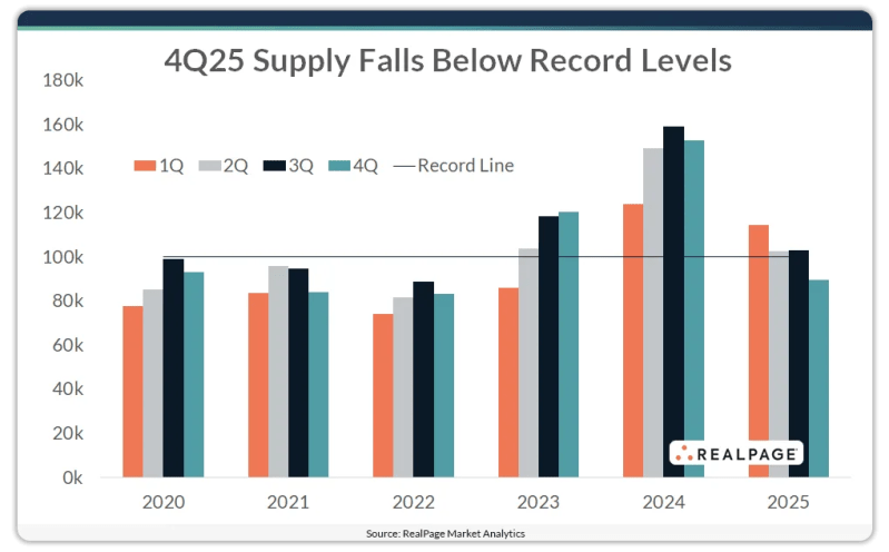 Roughly 89,400 units wrapped up construction in 4th quarter 2025, marking the first time in 11 quarters that deliveries fell below the 100,000-unit mark.