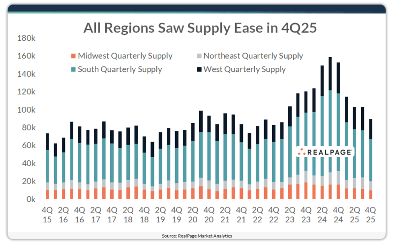 All regions of the U.S. saw supply volumes ease in 4th quarter, however, the South has also seen the steepest pullback in delivery volumes recently. Completions in the South peaked at nearly 91,800 units in 3rd quarter 2024 and volumes have fallen off every quarter since. The last three months of 2025 marked the first time South region completions totaled less than 50,000 units in 11 quarters.