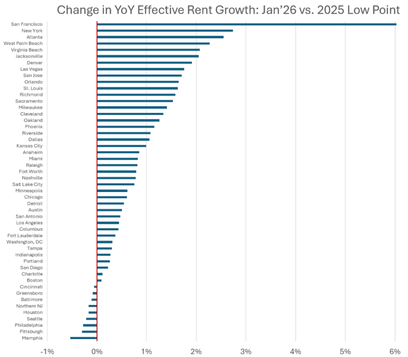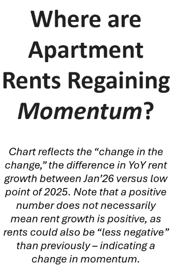 Of the 50 largest markets, 41 saw improvement in year-over-year rent change in Jan’26 versus the low point of 2025. In many Sun Belt/Mountain markets, rents are still falling but to a lesser degree than previously. If that sticks, it would suggest the deepest rent cuts occurred in 2025.