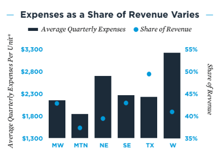 Expenses per unit, and as a percentage of revenue, vary dramatically based on the part of the country (Midwest, Mountain, Northeast, Southeast, Texas or the West) you’re in: