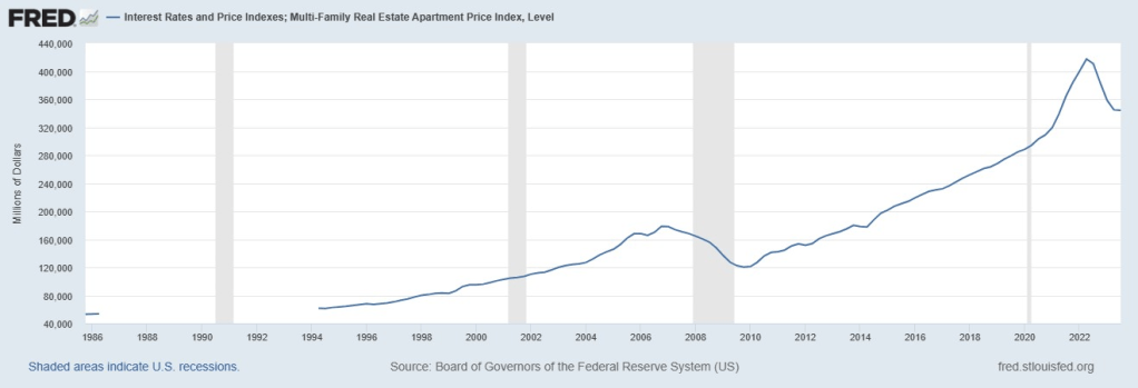 The Federal Reserve released multifamily price data through the end of Q3 showing a 2.1% decline quarter-over-quarter and a 16.2% decline year-over-year.