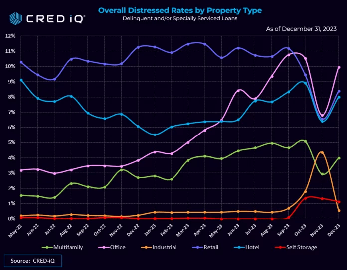 After a brief decline in November, distress in multifamily CMBS loans U-turned higher again in to finish the year. The chart below shows the percentage of multifamily CMBS loans delinquent, with special servicers or unable to be paid off at maturity (green line).