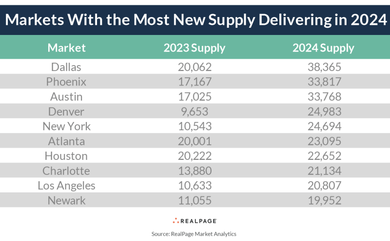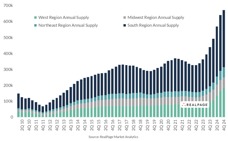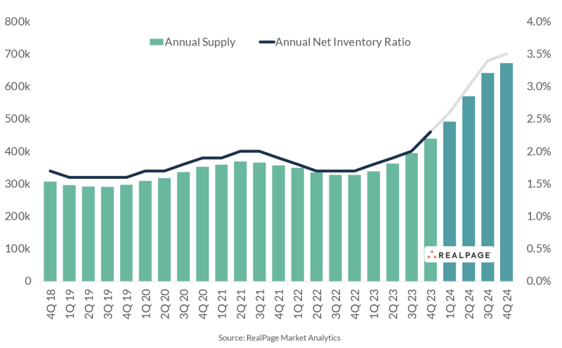 There were 440,000 multifamily units delivered in 2023 with 670,000 expected in 2024. This is the year when the new supply relative to current inventory will rocket higher: