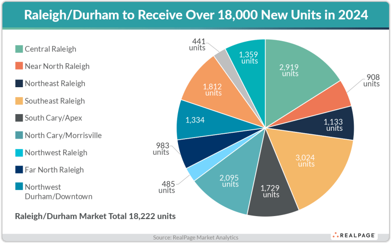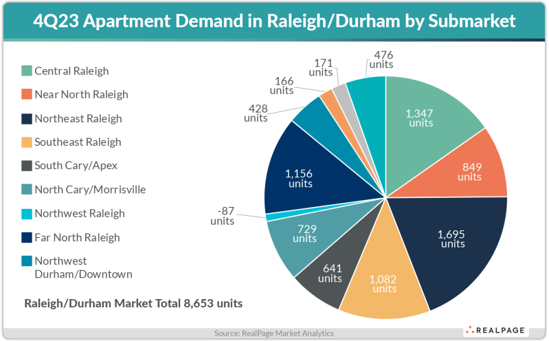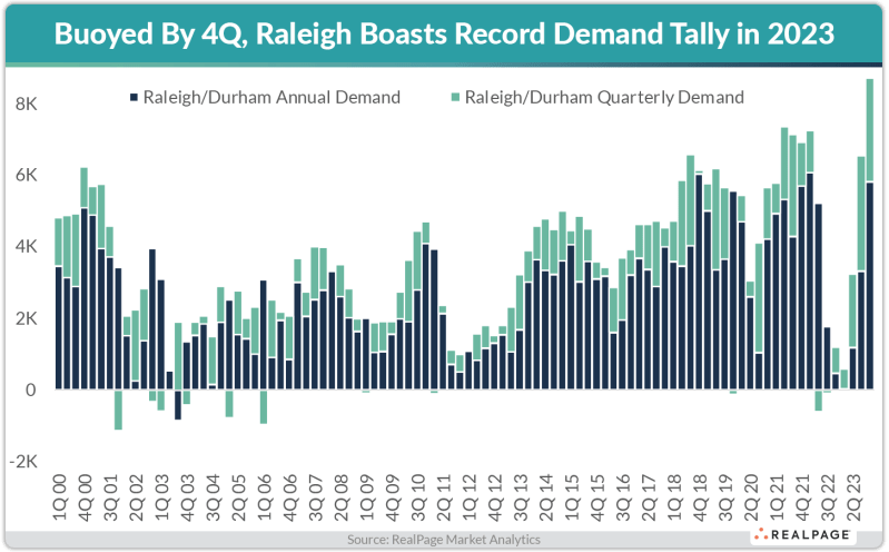 Raleigh’s demand reached an all-time high in the fourth quarter, absorbing 2,886 units. That was more than triple the market’s Q4 average over the last 10 years.
