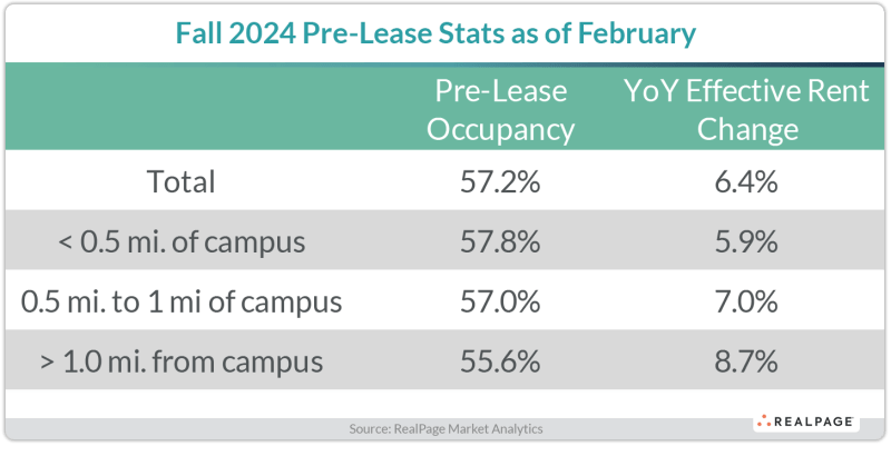 The February pre-lease rate is just below last year’s all-time high of 58.2% through February 2023. The long-term average is around 50% through February.