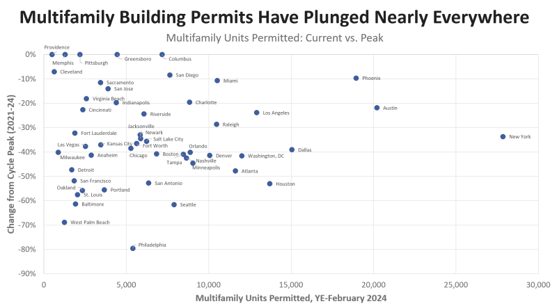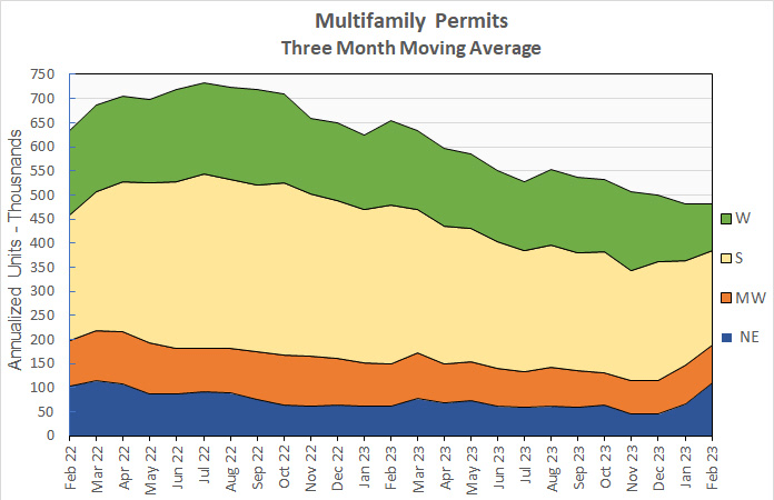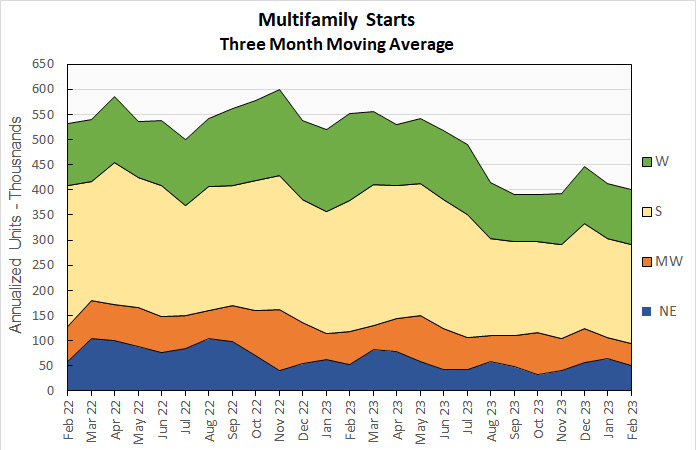 The data below uses a three-month weighted moving average and color codes by region (West, South, Midwest and Northeast):