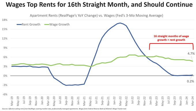 Wage growth has outpaced rent growth for 16 straight months. That trend will almost certainly continue through 2024– which would erase the entire rent>wage bump of 2021-22.