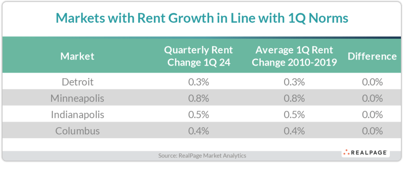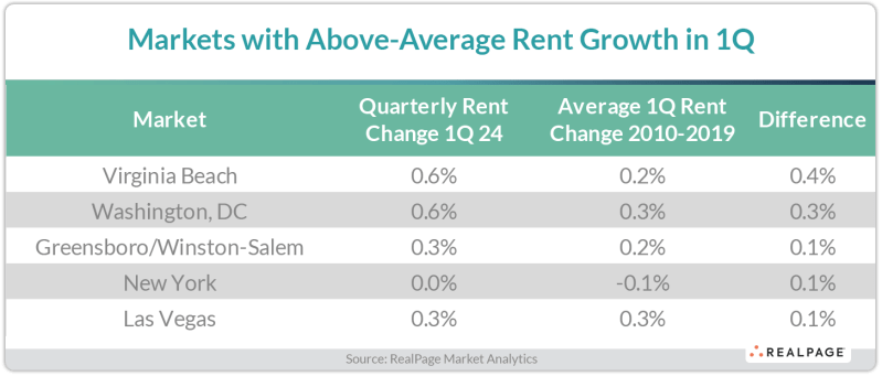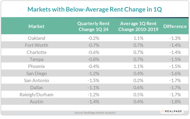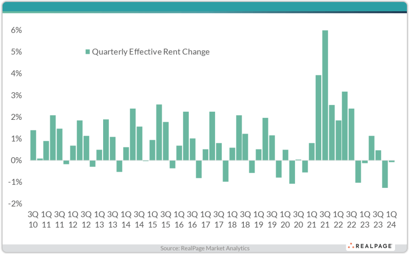 Effective asking rents in the U.S. overall fell by 0.1% in the January to March time period. That was a notable difference from the pre-COVID norm, which was growth of 0.6% during 1st quarter.