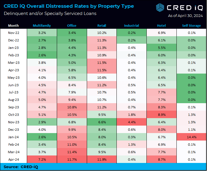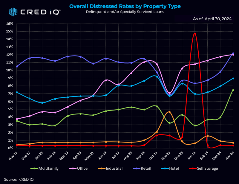 CRED iQ’s distress rate for all property types increased from 7.61% to 8.35%, a 74 basis points jump in April. Multifamily saw a whopping increase distress rate increase – from 3.7% in the March print to 7.2% in April. The increase is mostly attributable to a $1.75 billion loan ($561,000/unit) backed by Parkmerced, a 3,221-unit multifamily property in San Francisco.
