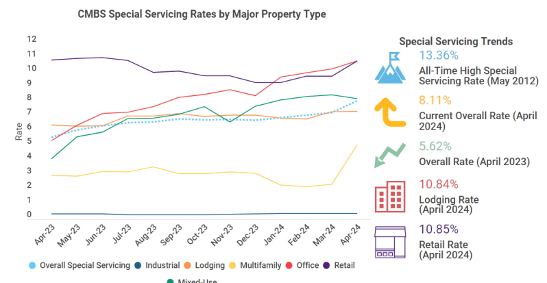The Trepp CMBS Special Servicing Rate leaped in April, rising 80 basis points to reach 8.11%. This marks the largest monthly jump that the rate has experienced in nearly four years, with higher monthly upticks only reached during the COVID-19 pandemic in mid-2020. The biggest movers were by far ‘Other’ properties and multifamily (yellow line), which increased a whopping 236 basis points and 269 basis points, respectively.