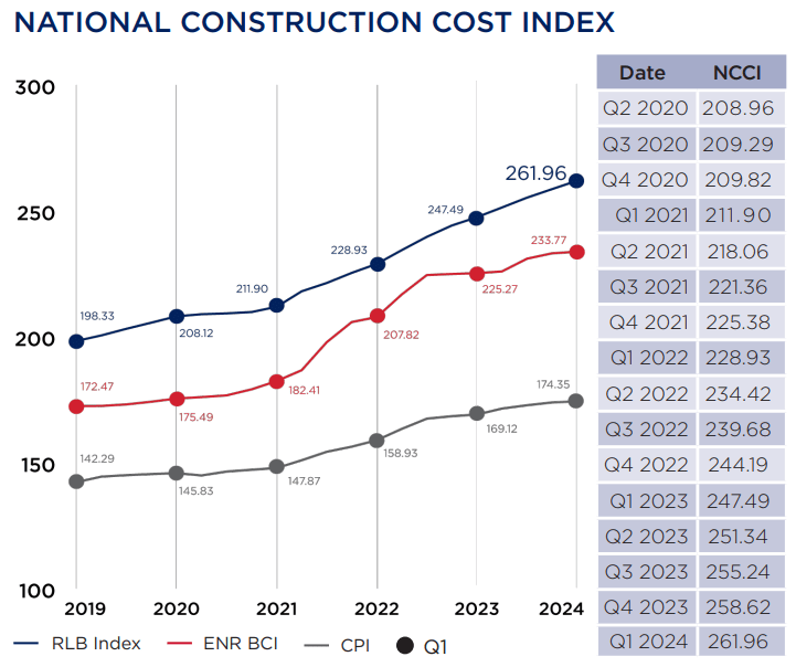 The latest RLB quarterly cost report, with data current to mid-Q1 2024, shows that the national average increase in construction costs was 1.29 percent, which is similar to pre-pandemic levels. This compares to 5.85% year-over-year.