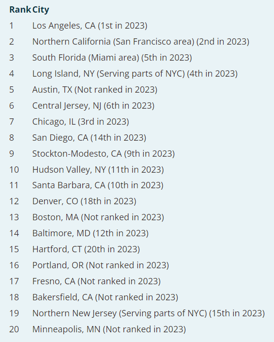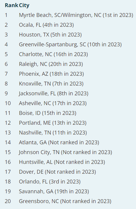 Last year, Florida claimed half of the top 10 spots on our list. This year, that stat goes to a rising dynamic duo: North and South Carolina. We see Greenville-Spartanburg, SC, climbing six spots to come in 4th on our list, while North Carolina’s Charlotte, Raleigh, and Asheville made equally notable gains into the top 10 after ranking below 15th in 2023.