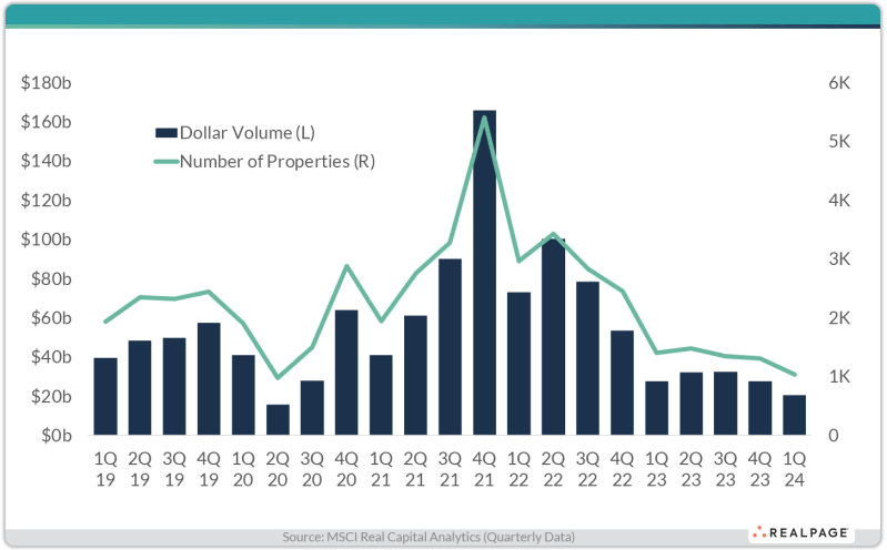 The overall sales volume during Q1 of 2024 was down 25% from Q1 of 2023, while the number of properties trading hands was down 26% during the same period.