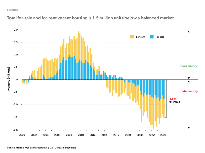 To bring the vacancy rate, both rental and homeowner, back in line with historical averages, the U.S. would need to add an additional 1.5 million vacant for-sale and for-rent homes.