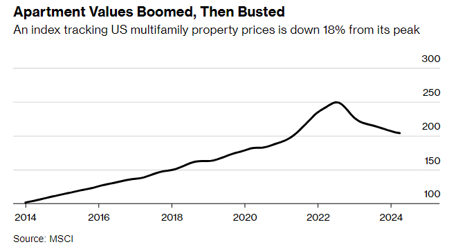 By June 2022, all sorts of trouble began to appear at once. The Federal Reserve had started hiking interest rates at the fastest pace in a generation. A swelling supply of newly built apartments contributed to flattening rents. And as the debt market dried up, sales of apartment buildings plummeted to $28 billion in the fourth quarter of 2023, down more than 80% from two years earlier, according to MSCI.