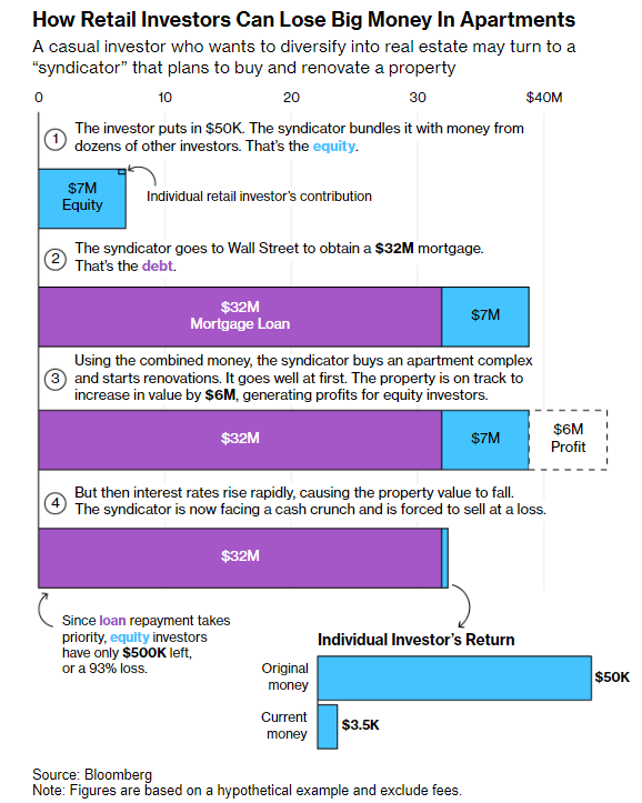 Large institutional players who bought buildings with traditional financing, without as much leverage, were in a better position to weather the turmoil and hold onto their buildings until values appreciated. But the floating-rate debt that had supercharged profits when rates were low has become a millstone for some syndicators. With loan payments soaring and capital for renovations drying up, they risked losing buildings to foreclosure or selling for a loss, with equity investors typically last in line for payment.