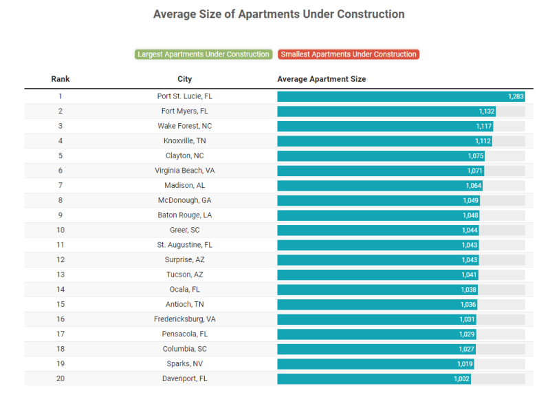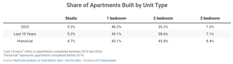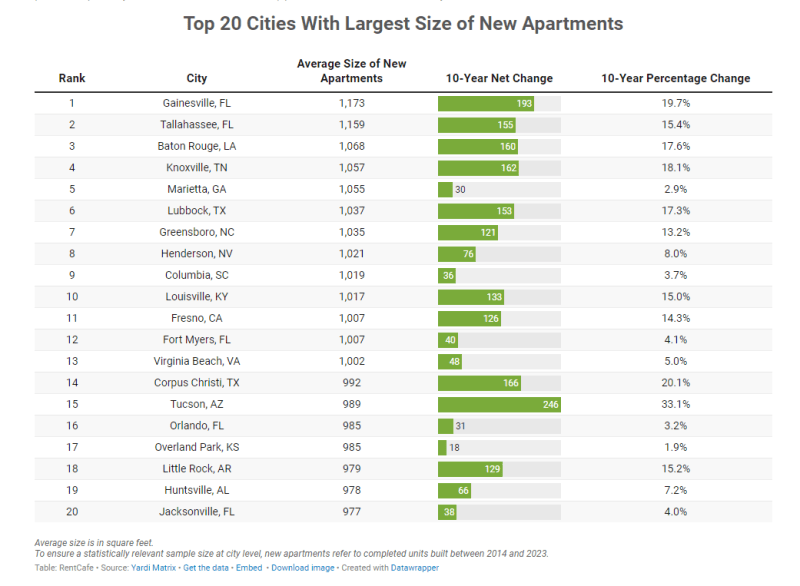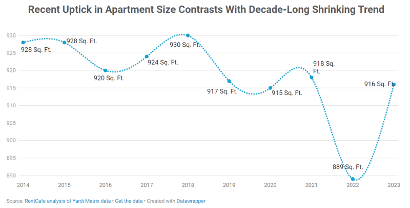 The average size of new apartments in the U.S. saw substantial growth in 2023, bouncing back to 916 square feet after a steep decline the previous year. This increase can be attributed to more spacious two- and three-bedroom apartments opening their doors last year as developers aimed to meet renters’ need for more space.