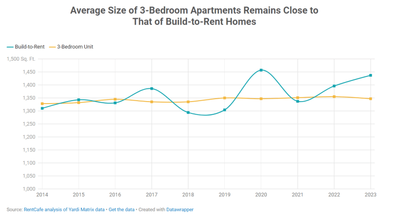 Three-bedroom apartments have been steadily getting roomier and remain close to single-family homes for rent in terms of floor space and rent costs: The size of a build-to-rent house increased to more than 1,400 square feet in 2023 for an average rent of $2,096, while the norm for a three-bedroom unit was close to 1,350 square feet and $2,160 in monthly rent. This is why, in some locations, renters might find it more convenient to rent a house as opposed to a three-bedroom unit.