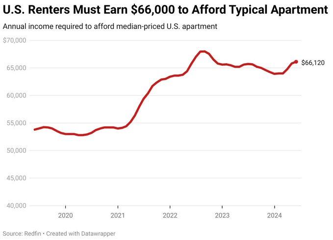 The typical U.S. renter household earns an estimated $54,712, which is 17.3% less than the $66,120 they must earn to afford the median U.S. apartment rent ($1,653).
