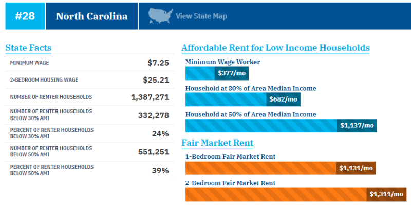 The 2024 “housing wage” for North Carolina is $25.21 per hour, which is an increase of $3.61 an hour when compared to the $21.54 per hour wage a worker needed in 2023 to pay for a modest apartment.