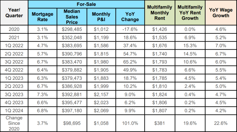 The chart below shows the rise in multifamily rents (19.6%) relative to wages (22.6%) since 2020, while monthly homeowner payments have risen by a staggering 101%.