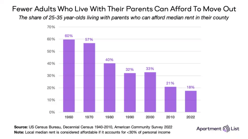 In the face of waning housing affordability, a growing number of Americans are continuing to live with their parents into adulthood. In 1970, just 7 percent of 25 to 35 year-olds lived in their parents’ homes, but as of 2022, that share has more than doubled to 17 percent.