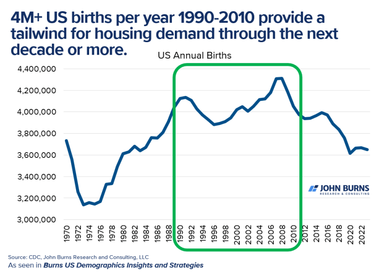 The most common age in the United States is people who are 31 and 32. Births spiked in the 1990s and first decade of this century, peaking around 2007/2008: