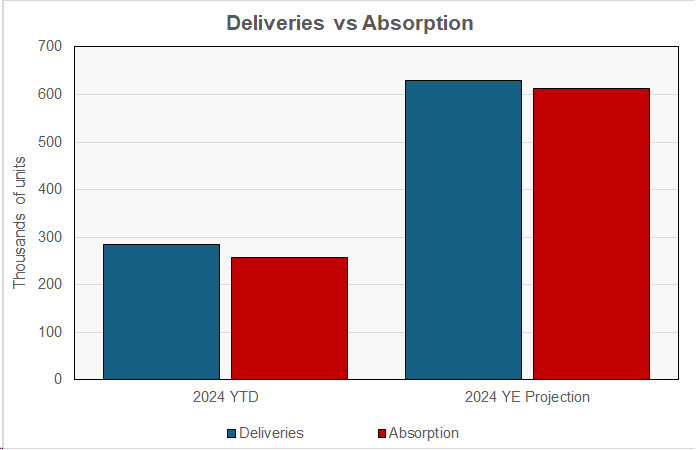 Berkadia anticipates that 2024 will have the highest number of deliveries in this cycle with 283,653 units already delivered in the first half of the year. By year-end, 629,153 new units are expected to hit the market. Berkadia expects net absorption of 612,115 units by year-end, equivalent to 97.3 percent of the new supply. This will result in the current occupancy rate of 94.2 percent rising slightly by the end of the year.