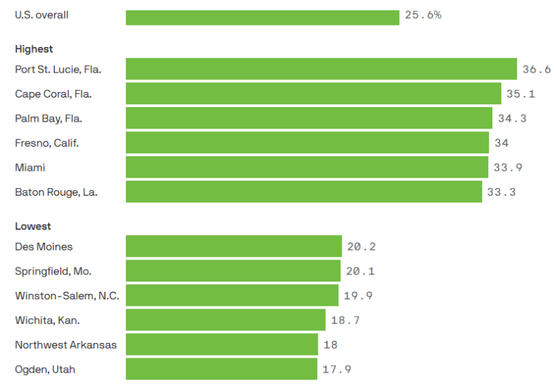 Just over a quarter (25.6%) of U.S. renters are spending more than half their income on housing, according to Census data out this month. The real median gross cost of renting — that’s rent plus utility/energy costs — grew faster annually (+3.8%) than real median home values (+1.8%) last year for the first time in a decade.