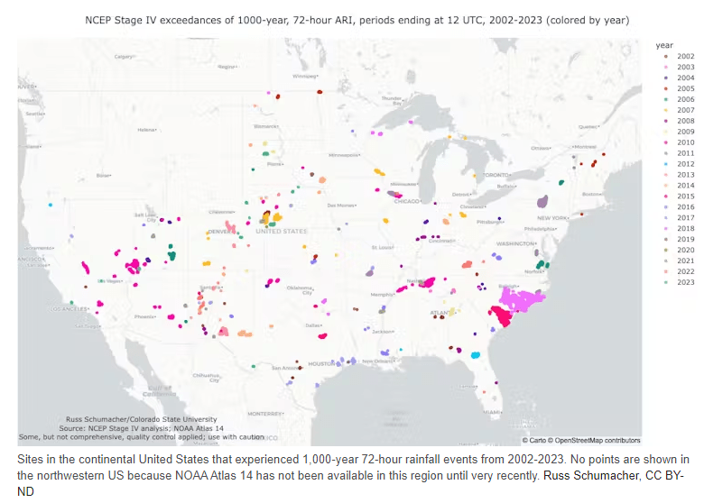 Put another way, even if you are unlikely to experience a 1,000-year storm at your location, there likely will be 1,000-year storms somewhere in the country every year.
