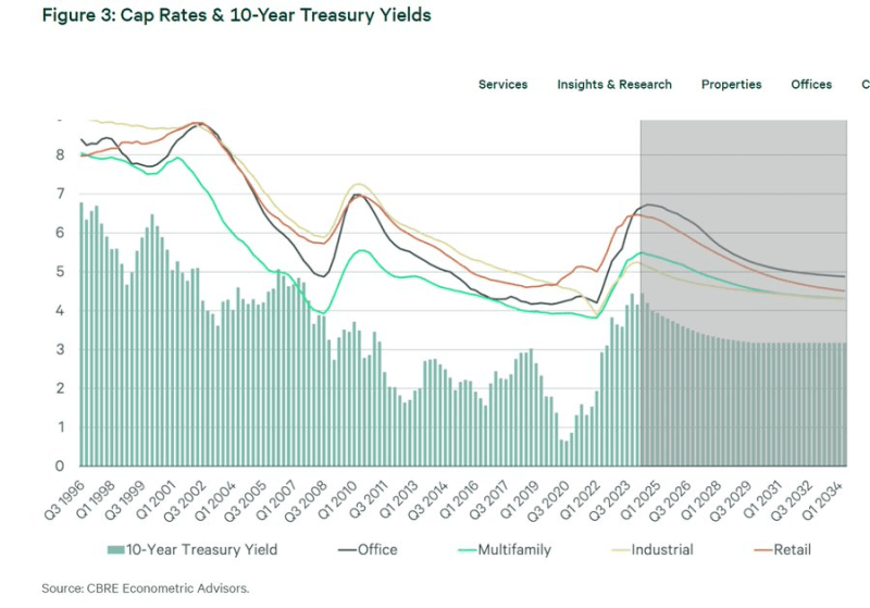 The 28 year relationship between the 10 year treasury yield and cap rates on different commercial real estate sectors. For every 100 basis point move in the 10 year treasury, multifamily cap rates move about 70-80 basis points.