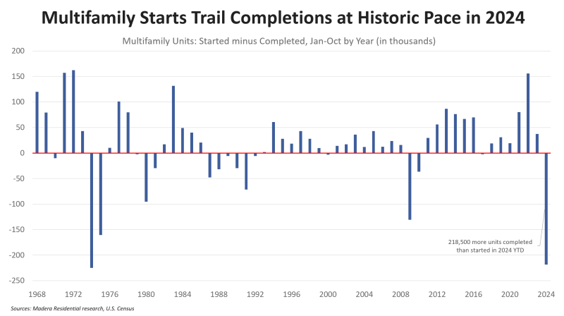 Multifamily starts for October came in lower than any October in the last 12 years. Year-to-date, completions are outpacing starts by 218,500 units. This is a massive deficit that will significantly reduce apartment supply in 2026. Source: Jay Parsons (11/19/24)