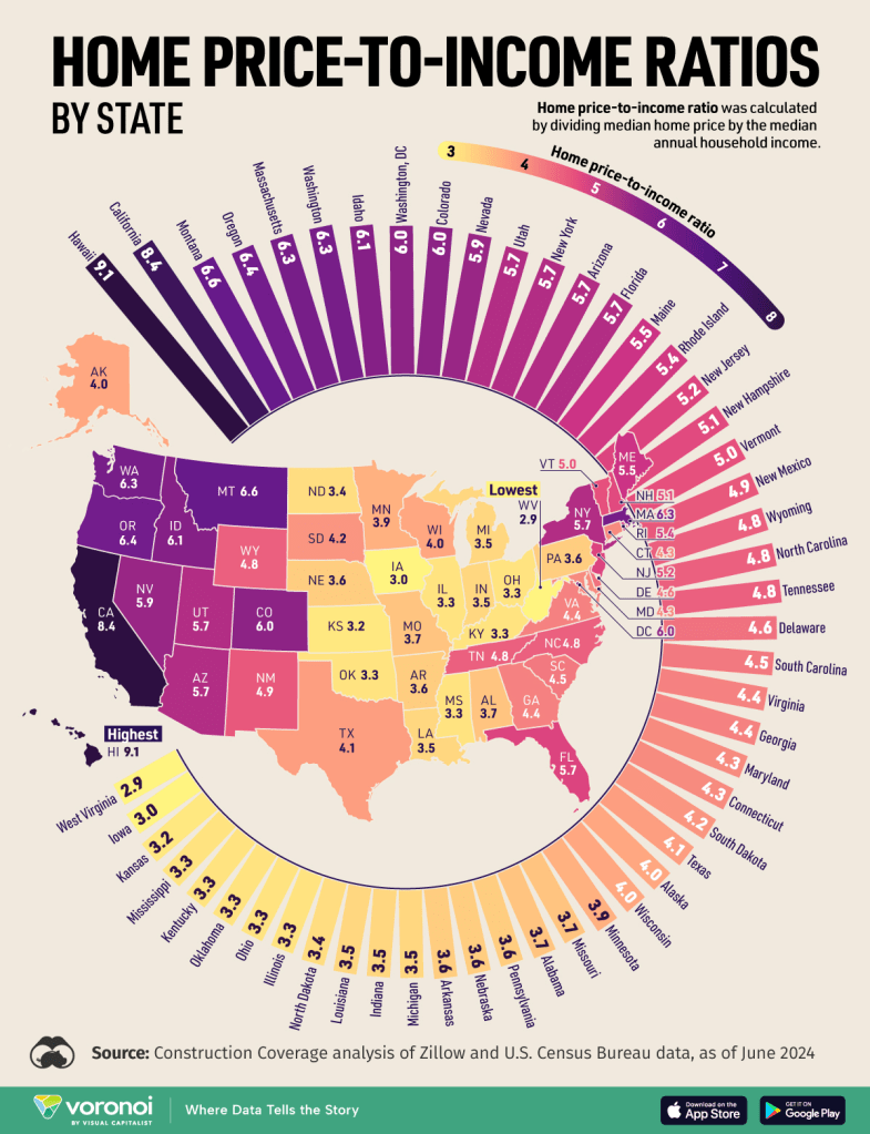 The heat map below shows home price to income ratios by state. The higher the number (darker states), the more unaffordable home ownership is in that state. While this is unfortunate for potential home buyers, it will keep tenants renting longer in those states:
