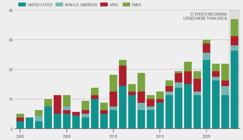 - In 2022, U.S. losses accounted for 75% of total global insured losses.