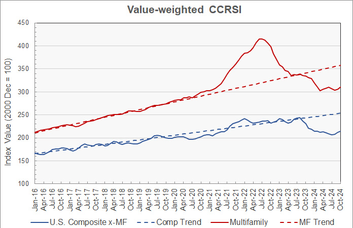 - The value-weighted index of multifamily prices rose 1.4 percent month-over-month in October. The index was down 7.1 percent year-over-year.