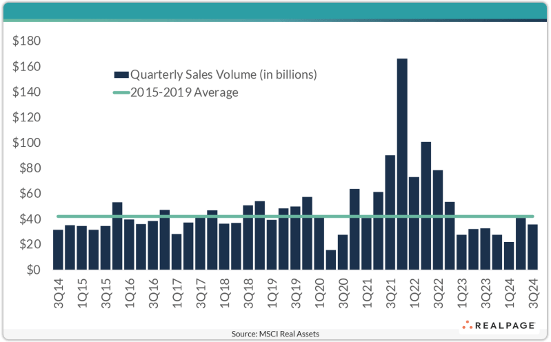 - Apartments accounted for 37% of all commercial real estate sales in 2024’s 3rd quarter, and they are back in line with pre-pandemic standards