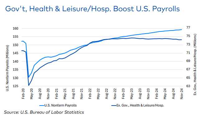 If you remove government and hospitality/leisure jobs from the payroll reports, jobs have been stagnant and declining for over 2 years. The new administration’s focus on cutting government spending could slow government job growth and provide room for the Fed to cut rates more dramatically.