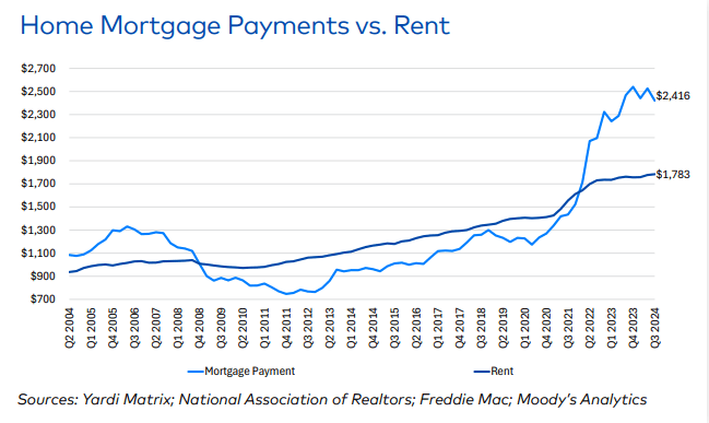The cost to purchase a home vs. renting remains at a historically high, a tailwind for rent prices entering 2025: