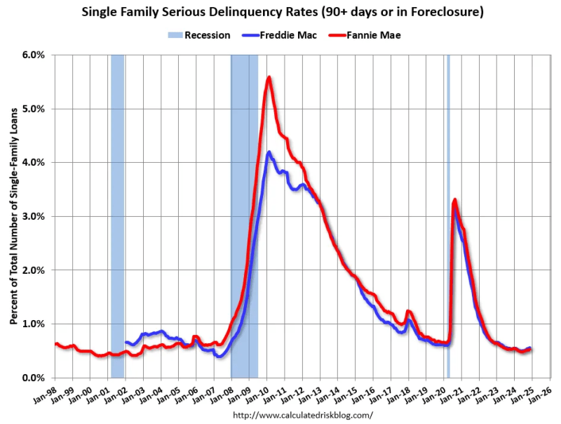 Fannie & Freddie serious delinquency levels are currently very low. These are mortgage loans that are three monthly payments or more past due or in foreclosure: