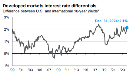 From J.P. Morgan’s Q1 2025 Guide To The Markets, a nice visual of how much higher the 10-year treasury is in the United States is vs. the rest of the developed world. This makes U.S. bonds look more attractive to investors and helps keep a cap on yields: