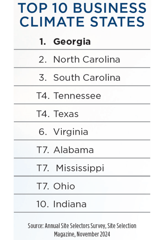 In the annual Site Selectors Survey, Georgia received the most votes to dethrone last year’s winner, Texas, for Best Business Climate in the nation. North Carolina finished just behind Georgia in the runner-up spot, followed by South Carolina in third. South Carolina garnered the most votes for the state they believe has the best manufacturing workforce in America.
