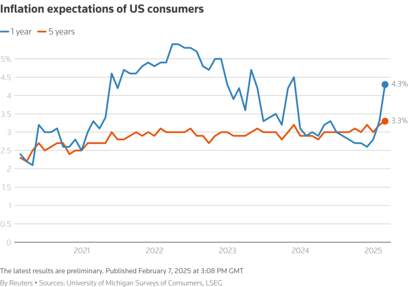 Year-ahead inflation expectations jumped up from 3.3% last month to 4.3% this month, the highest reading since November 2023 and marking two consecutive months of unusually large increases. This is only the fifth time in 14 years we have seen such a large one-month rise (one percentage point or more) in year-ahead inflation expectations.