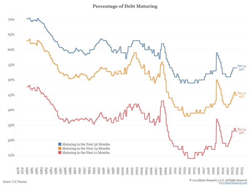 There’s been a fear cycle in the media recently talking about how 1/3 of the federal debt needs to be refinanced in the next year (and how this will negatively impact treasury yields). In reality, 1/3 of the debt always needs to be refinanced in the next year and about half always needs to be refinanced in the next 3 years. See below going back to the late 70’s: