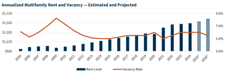 We have upgraded our outlook for the national multifamily sector to “improving” for 2025. We expect the multifamily sector will see slow but continued improvement in demand this year, possibly resulting in flat rent growth and a slightly rising national vacancy rate during the first quarter of 2025 due to the amount of new supply entering the market, especially during what is normally a slow lease-up time of year. After that period, we expect multifamily fundamentals will strengthen, with moderately increasing rent growth and stabilizing vacancy levels.