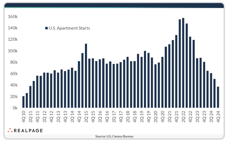 U.S. multifamily starts have declined precipitously in the past year and a half and hit a 13-year low mark in 4th quarter 2024. A little over 37,000 apartment units got off the ground in the last three months of the year.