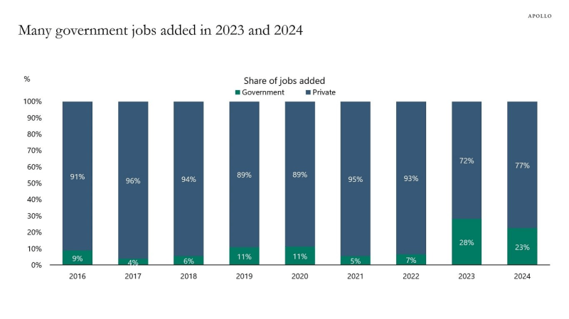 25% of jobs added in the US economy over the past two years were government jobs, up from 5% in 2021 and 7% in 2022. If hiring turns into net layoffs in 2025, it could severely impact the jobs market (leading to the Fed cutting interest rates faster than anticipated).