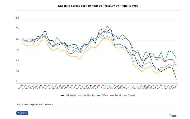 Cap Rate Spreads Over The 10-Year Treasury Yield Rose Multifamily Uncategorized June 13, 2025 1 Minute Have been at historic lows for multifamily since 2022 (yellow line below): Share this: Click to share on X (Opens in new window) X Click to share on Facebook (Opens in new window) Facebook Like Loading... Related Published by Rose Multifamily View all posts by Rose Multifamily Published June 13, 2025