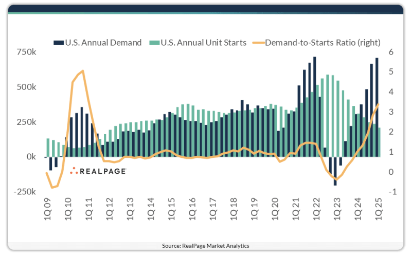 209,000 new market-rate apartment units started construction across the U.S. year-ending 1st quarter 2025. There were 708,000 units were rented over the same period, marking the highest demand-to-starts ratio since 2010.